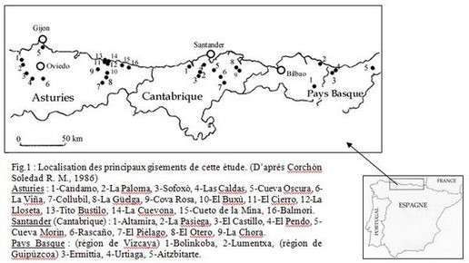 Cette synthèse est le résultat de l’analyse minutieuse de 107 éléments de parure divers conservés au Museo Regional de Prehistoria y Arqueologia de Cantabria à Santander (Espagne) et d’une étude bibliographique complète regroupant 497 éléments de parure répartis dans de nombreux gisements du Paléolithique supérieur des régions des Asturies, de Santander (Cantabrique) et du Pays Basque. Parmi les gisements les plus riches en parure, citons tout de même La Paloma, Tito Bustillo, Cueto de la Mina, Las Caldas dans les Asturies, Altamira, La Pasiega, El Pendo, Cueva Morìn, Rascaño à Santander et Bolinkoba au Pays Basque. (fig.1)